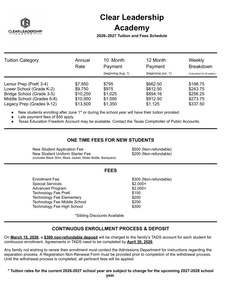 *Payment options and discounts are available. Tuition covers all academic and leadership programs throughout the year. Some special programs may have additional fees attached.